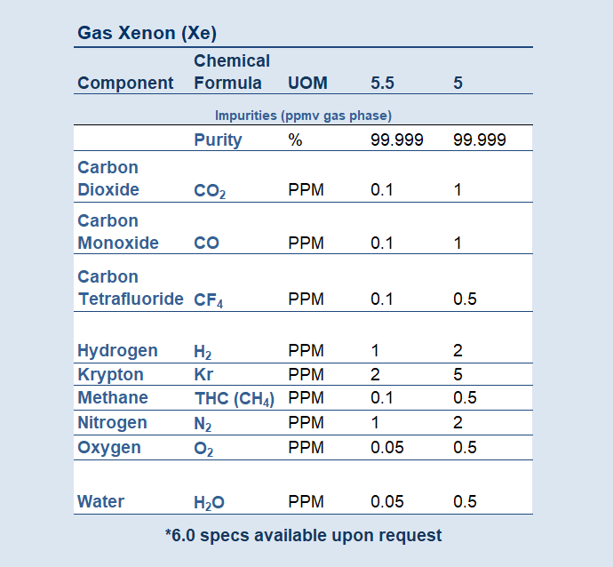 Xenon is a dense, colorless noble gas with unique ionization properties that allow it to be used in a variety of high- tech applications. Its ability to efficiently generate and maintain an ionized state makes it indispensable for ion propulsion in aerospace and specialized medical imaging techniques. Xenon is also used in semiconductor etching.